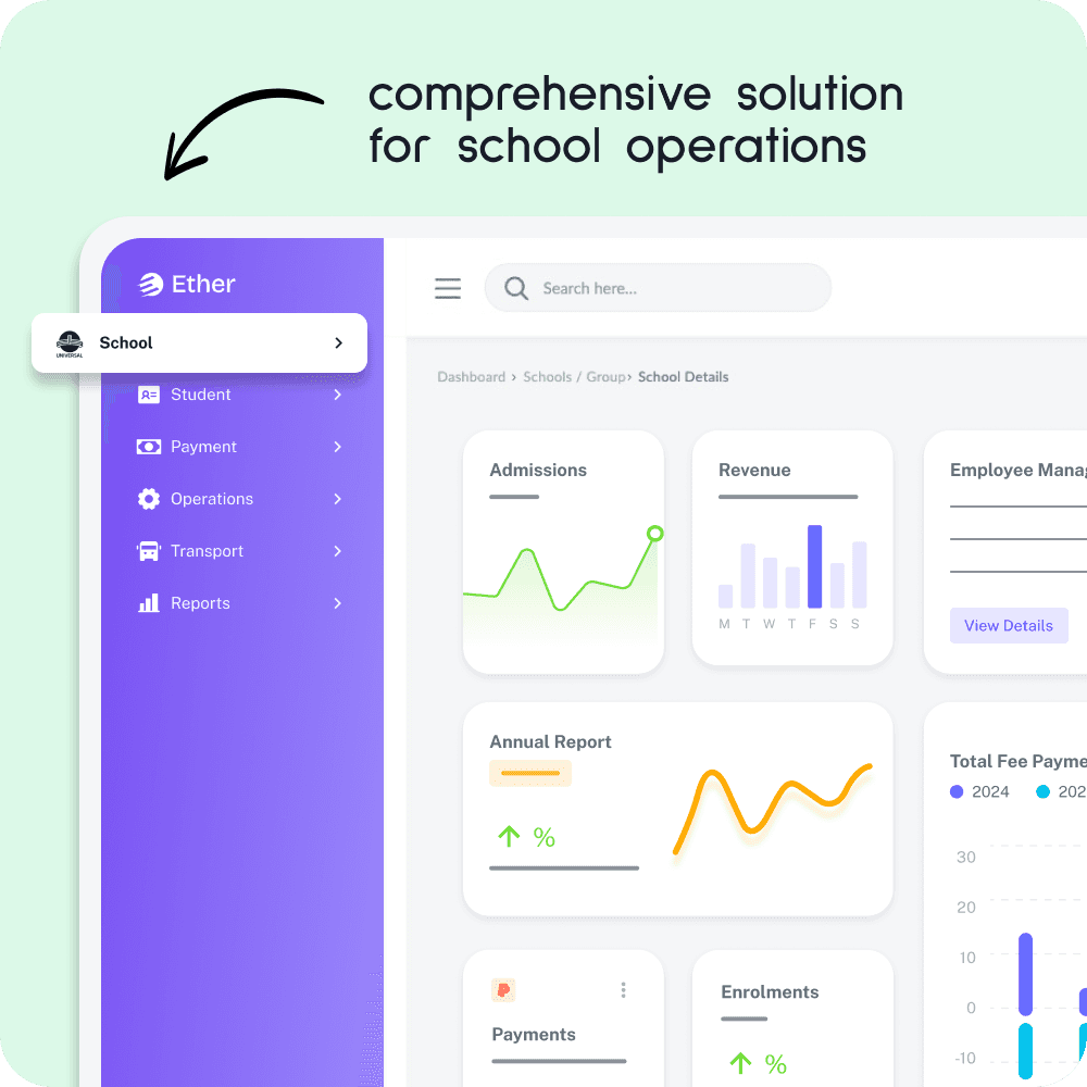 Ether is a comprehensive school operating system that simplifies daily operations while enhancing the academic experience and parent engagement. From admissions and fee collection to transport tracking, communication, attendance, and academic updates, Ether brings everything together into one seamless digital platform. Ether automates routine tasks, reducing staff workload, improving operational efficiency, and offering a smooth, modern experience for school teams and families. With a branded mobile app and intuitive tools, Ether helps schools delight parents, empower staff, and drive enrolments.
